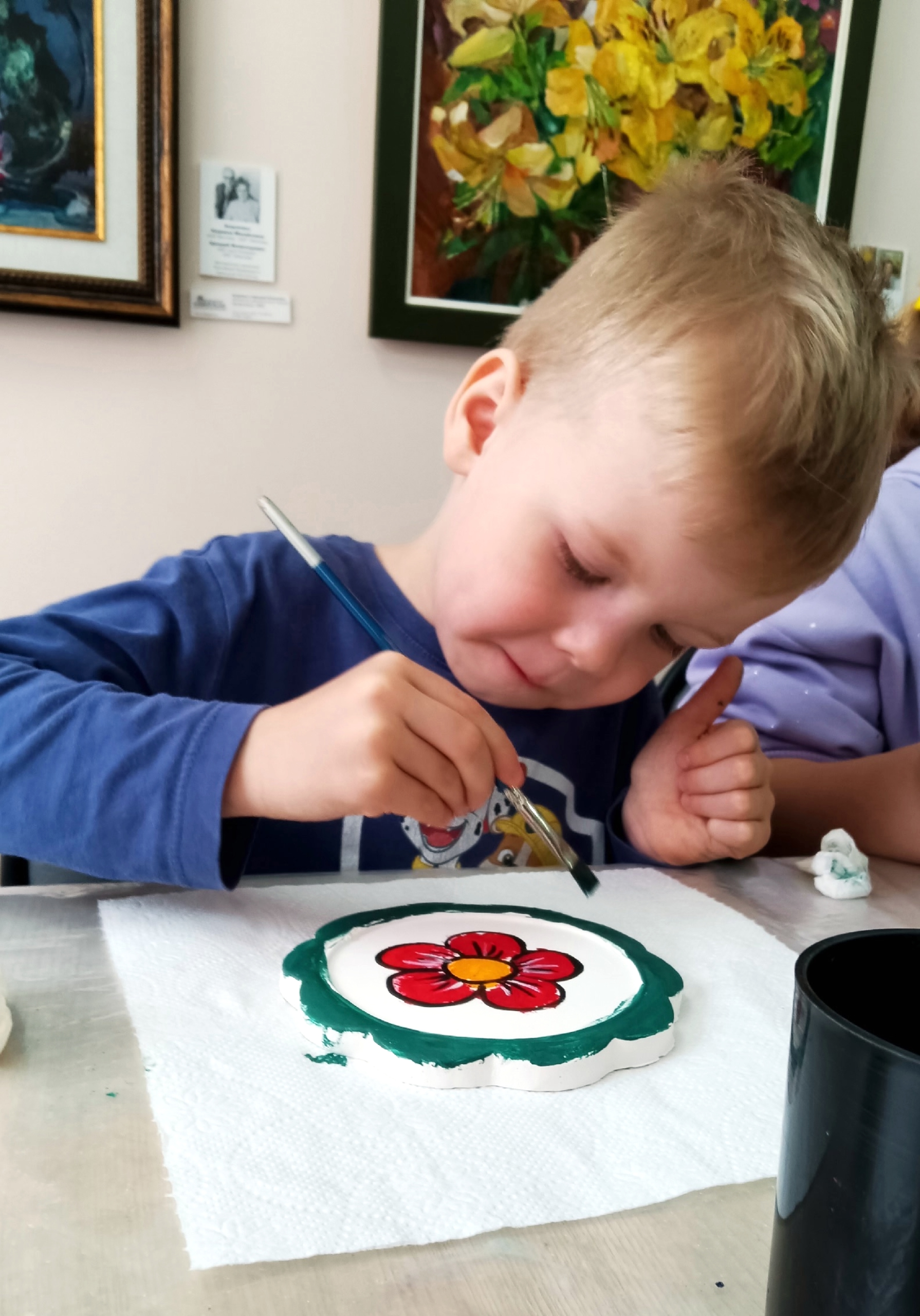 Вдохновившись, в творческой мастерской ребята сами создают подарок: украшают декоративные тарелки цветочным узором!