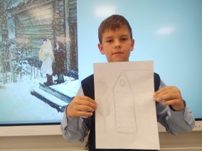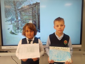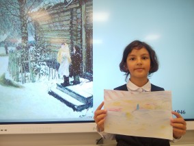 Затем школьники рассмотрели и обсудили работу "Первый снег", написанную автором в родной деревне Прислонихе, где он жил и черпал вдохновение.