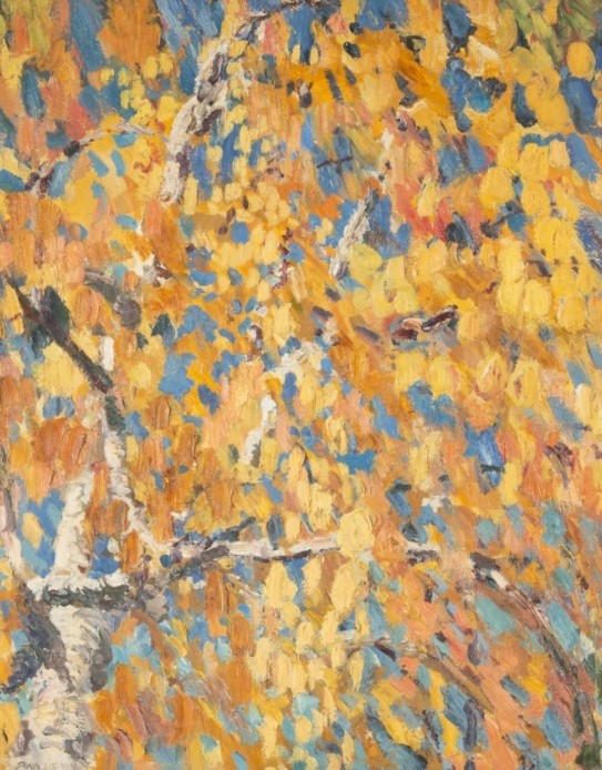 Яковлев М. Н. Осенние листья 1909 Художник обратился к импрессионизму в конце 1900-х, закончив длительный этап символистских поисков. Его ранняя из импрессионистических картин – «Осенние листья» еще несет печать декоративности модерна, а полотнам 1910-х («Лодки на Москве-реке») свойственна уже почти фовистская напряженность цветового решения. Это связано и с общим повышением цветовой звучности русской живописи тех лет, и с интенсивной работой Яковлева в музыкальных театрах. Работы, посвященные осени, на портале «Виртуальный Русский музей»