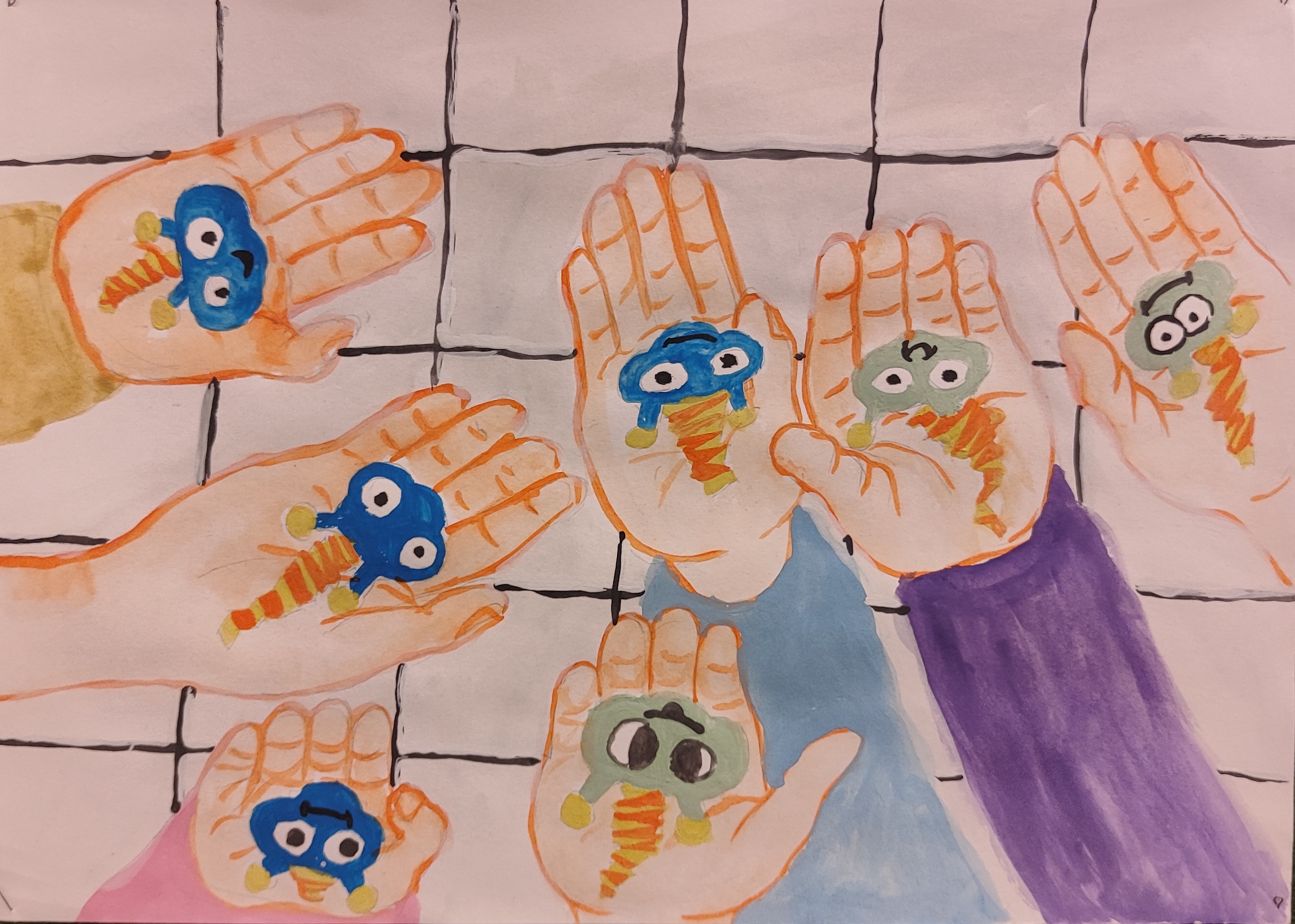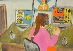 Первое место Романа Я. за гуашь «Искусство через монитор». Стопроцентное попадание в тему. Жюри узнало и оценило изображение остановки рабочего кабинета ИОЦ, где происходят игровые занятия участников Клуба.