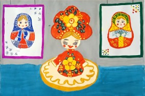 Третье место у Элины И. за гуашевый рисунок «Выставка русской матрешки». Порадовало, что труды галереи по пропаганде русской народной игрушки запомнились.