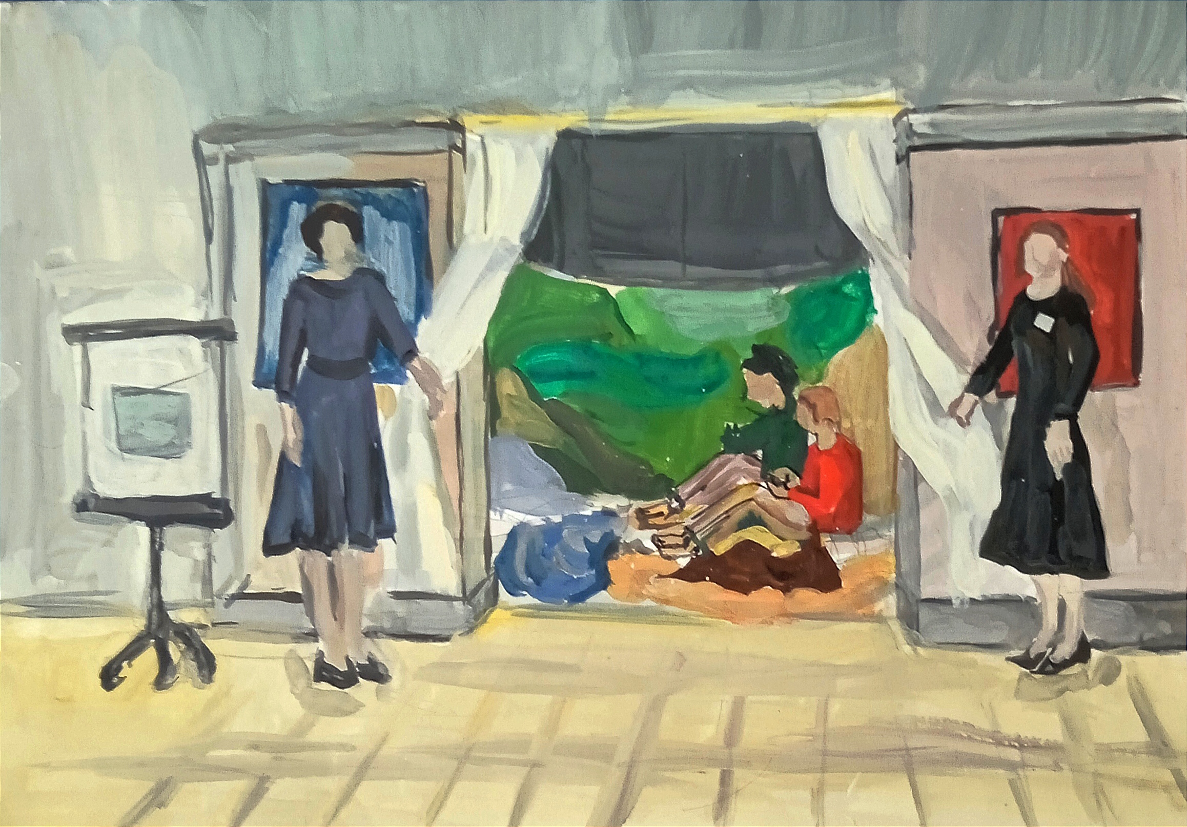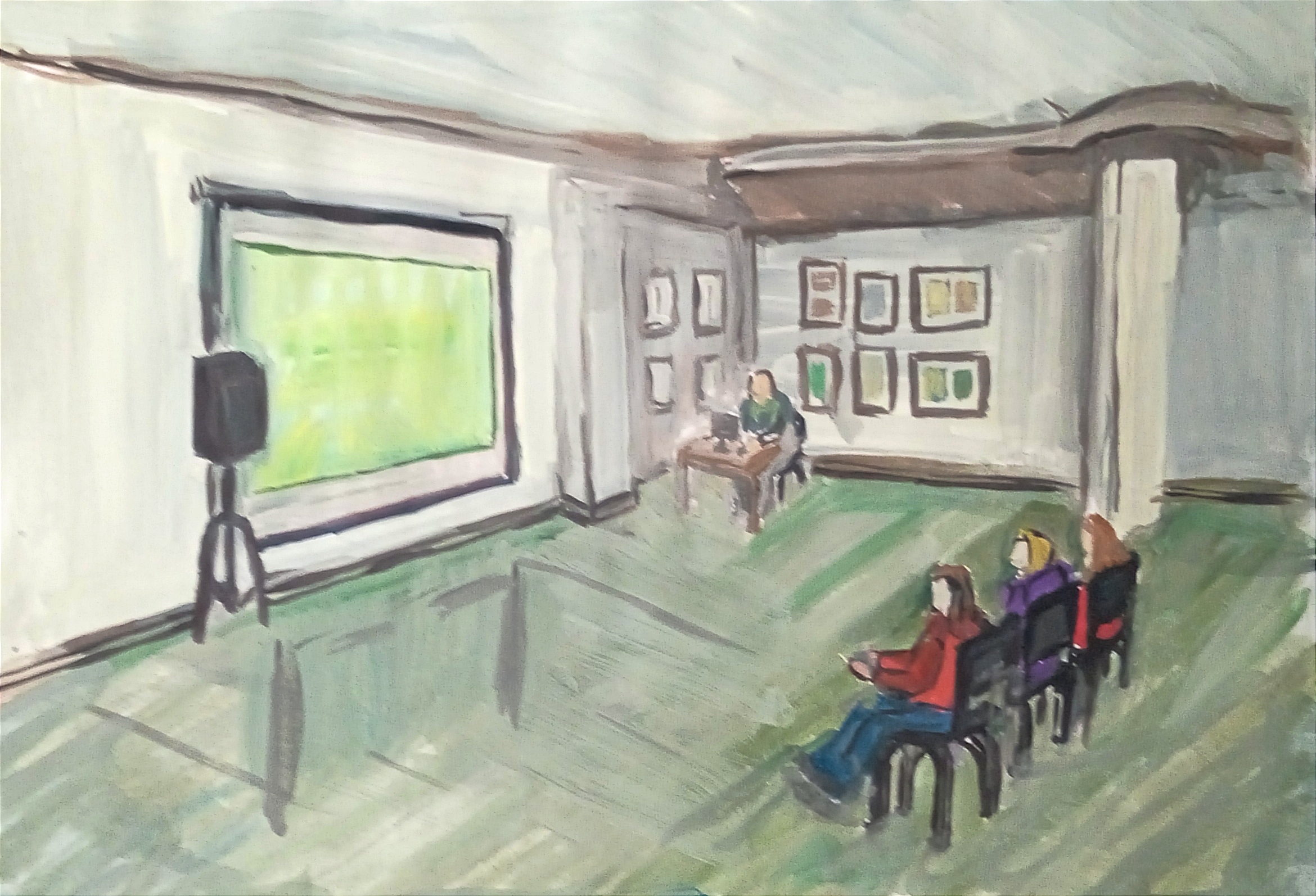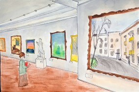 Второе место у Виктории К. за акварель «Диалог с искусством». Членам жюри понравилась атмосферное изображение занятия в информационно-образовательном центре Виртуального русского музея.