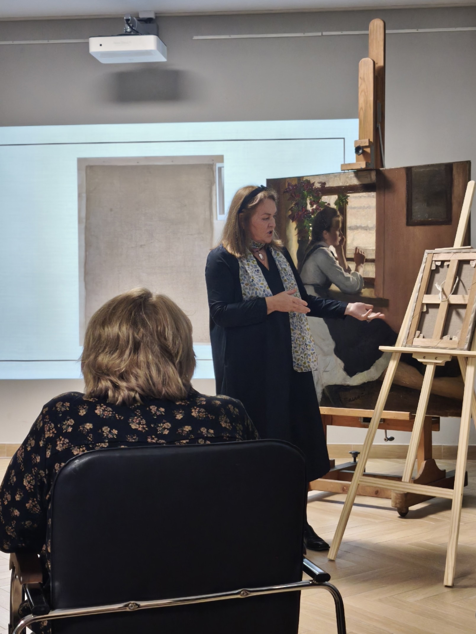 Реставратор масляной и темперной живописи музея на лекции-встрече рассказала о работе над картинами художника И.С. Далматова, особенностях реставрационных процессов и в целом труде реставратора.