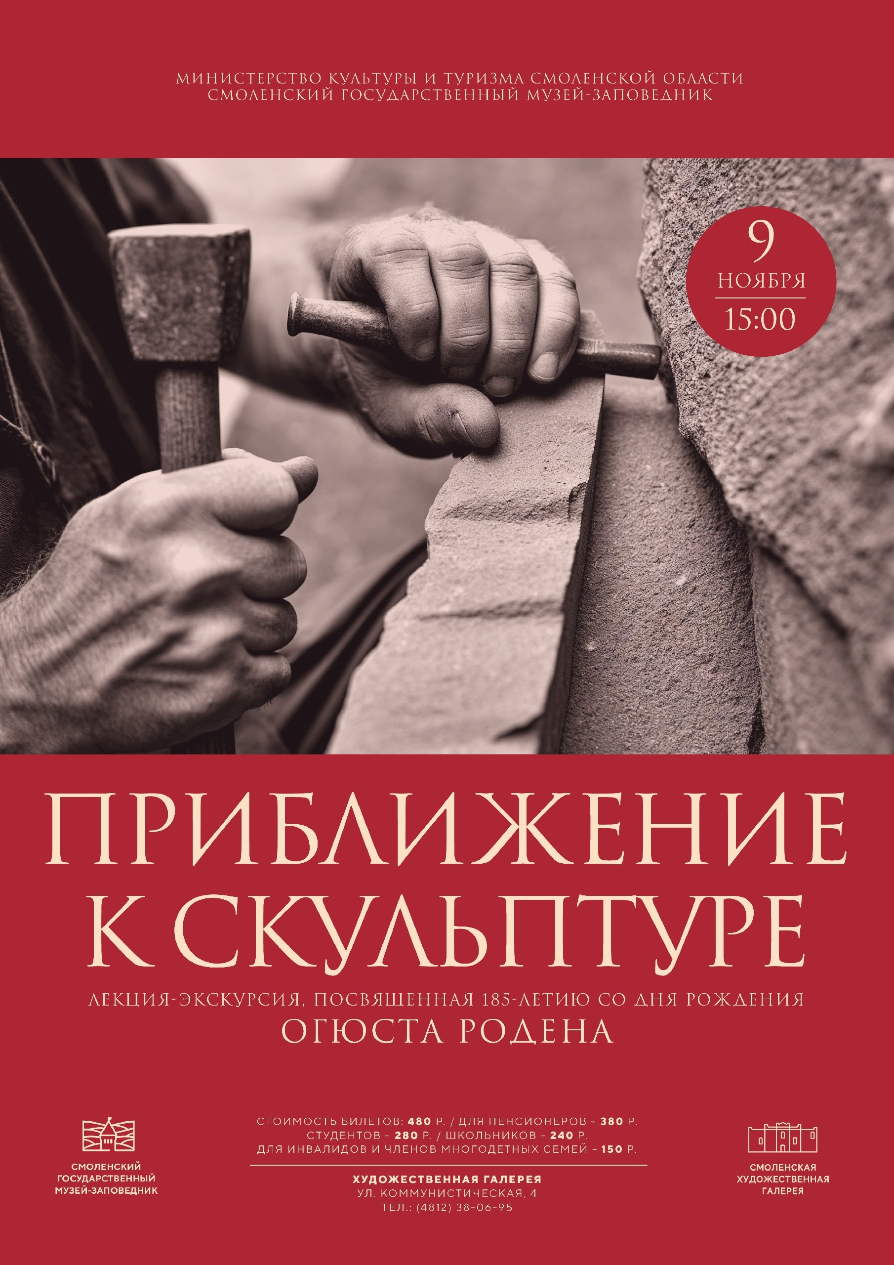 9 ноября в 15.00 в Художественной галерее состоялось мероприятие, посвященное автору знаменитого «Мыслителя» и «Вечной Весны» Огюсту Родену, приуроченное к 185-летию со дня рождения французского скульптора. Первая часть встречи прошла в формате лекции, на которой гости галереи узнали о творческом пути мастера, который далеко не сразу был понят современниками, о знаменитых и малоизвестных произведениях Родена. Вторая часть будет прошла в формате экскурсии, где посетители познакомились с произведениями русских и европейских скульпторов в экспозиции Смоленской Художественной галереи.