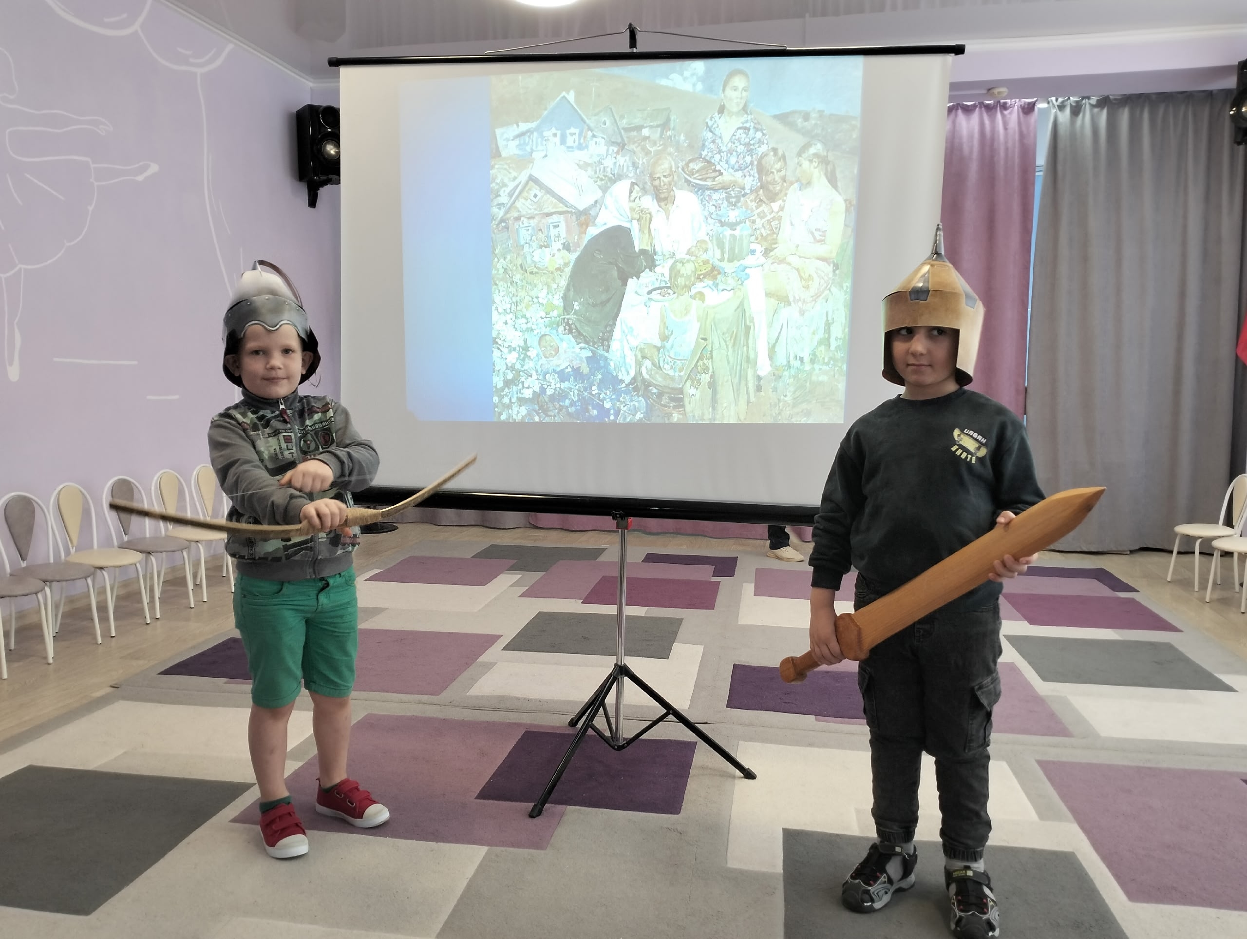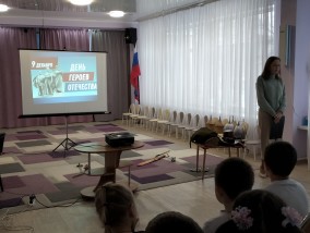 9 декабря — День героев Отечества. А кто такие герои? Что надо уметь, чтобы стать героем? Какими качествами должен обладать герой? На эти вопросы отвечали воспитанники детского сада «Заинька». Ребята вспомнили богатырей, узнали об Александре Невском и Дмитрие Донском, вспомнили героев Великой Отечественной войны и современных военных операций. На экране смотрели картины из Виртуального тура «Страна Побед. К 80-й годовщине Победы в Великой Отечественной войне» (rusmuseumvrm.ru/data/vtour...). А также примерили образ богатырей и солдата.