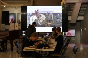 На мастер-классе ребятам было предложено сделать объёмный коллаж с включением элементов комикса, заметок из истории искусства и собстенных рисунков и размышлений. Также в качестве раздаточного материала можно было использовать несколько страниц из новой интерактивной тетради "Илья Машков и его мастеркая".