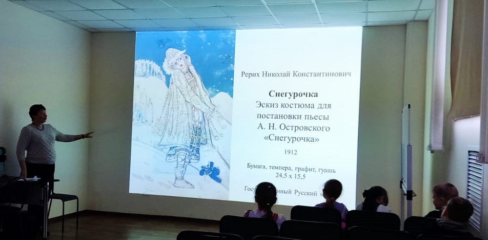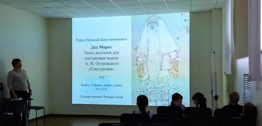 Ученики школы № 4, посетившие виртуальный филиал Русского музея, узнали о том, что зимний чародей давно стал любимцем народных сказок, литературных произведений, спектаклей и музыкальных постановок. Художники также часто изображали волшебного старца и его верную спутницу Снегурочку.