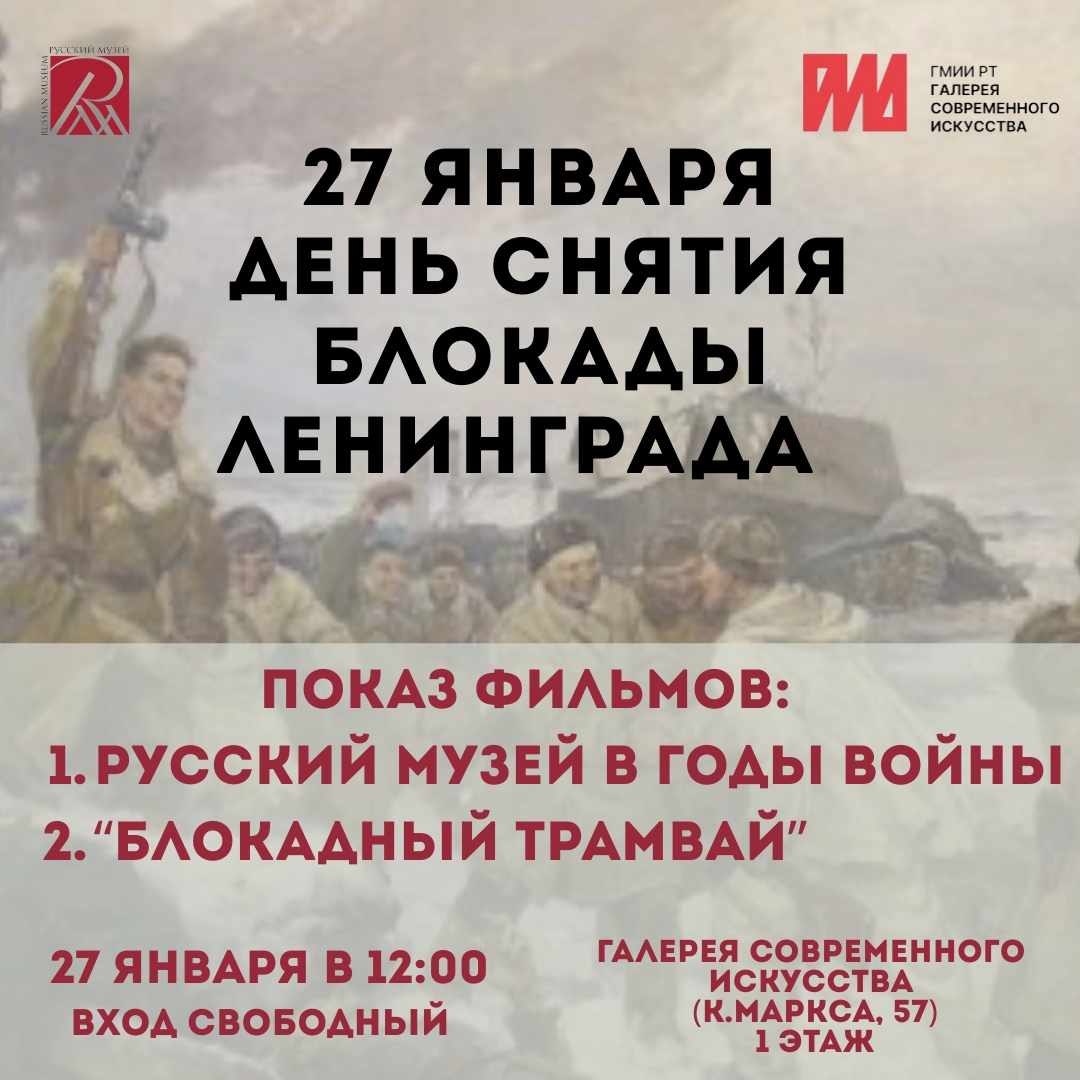 27 января в Галерее современного искусства ГМИИ РТ состоялся показ фильмов Русского музея "Блокадный трамвай", 2003 г. и "Русский музей в годы войны" 2005 г.