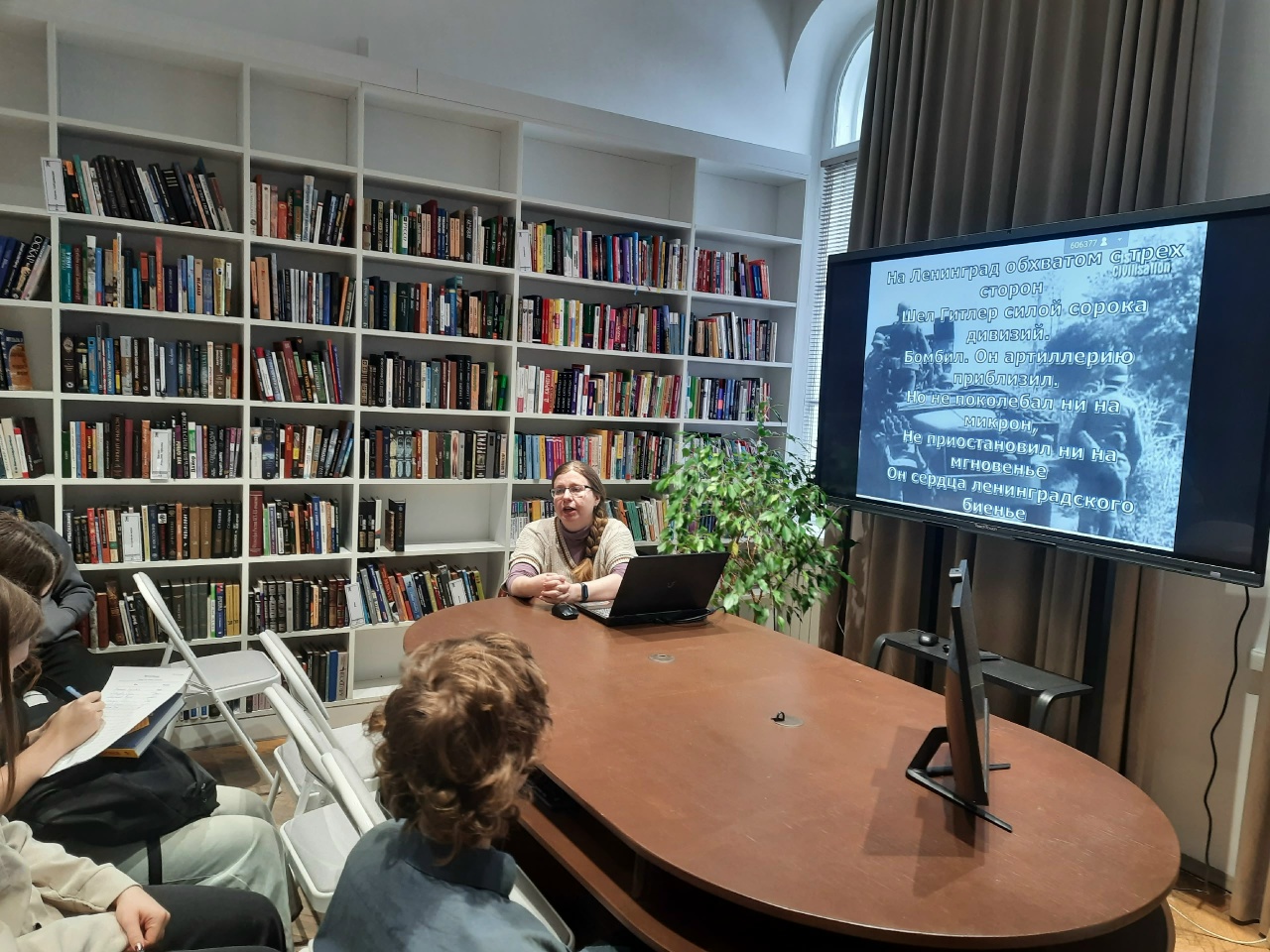 Уже с первых дней войны на на стенах Ленинграда появлялись плакаты. Они призывали на борьбу с врагом, взывали к мщению, помогали жить, бороться, верить. Посетители лекции узнали о деятельности коллектива плакатистов "Боевой карандаш", познакомились с плакатами Н.А. Тырсы, В. Серова, А. Казанцева. Также рассмотрели работы И. Серебряного, сравнивали современный Петербург и Ленинград В. Пакулина и В. Кучумова. Поразили школьников работы Людвига Симонова, который писал блокаду по своим детским воспоминаниям. Его работы как будто спрятаны за пеленой, запорошены снегом...