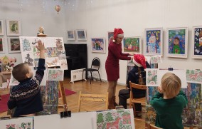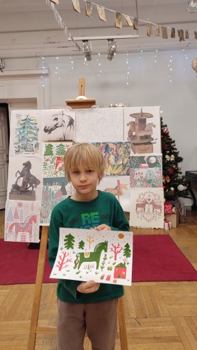 В начале мероприятия ребята познакомились с некоторыми произведениями из коллекции Государственного Русского музея, в которых главный персонаж — конь или лошадь. Дети познакомились с основами композиции, как правильно смешивать цвета, что такое ритм в рисунке, и сделали открытку в декоративном стиле. Изобразили символ 2026 года — сказочную лошадку. Научились создавать работу в ограниченной палитре, используя только красный и зелёный цвета и их оттенки. Изучили приёмы декоративного рисунка, создали свою неповторимую композицию, используя стилизованные элементы новогоднего праздника.