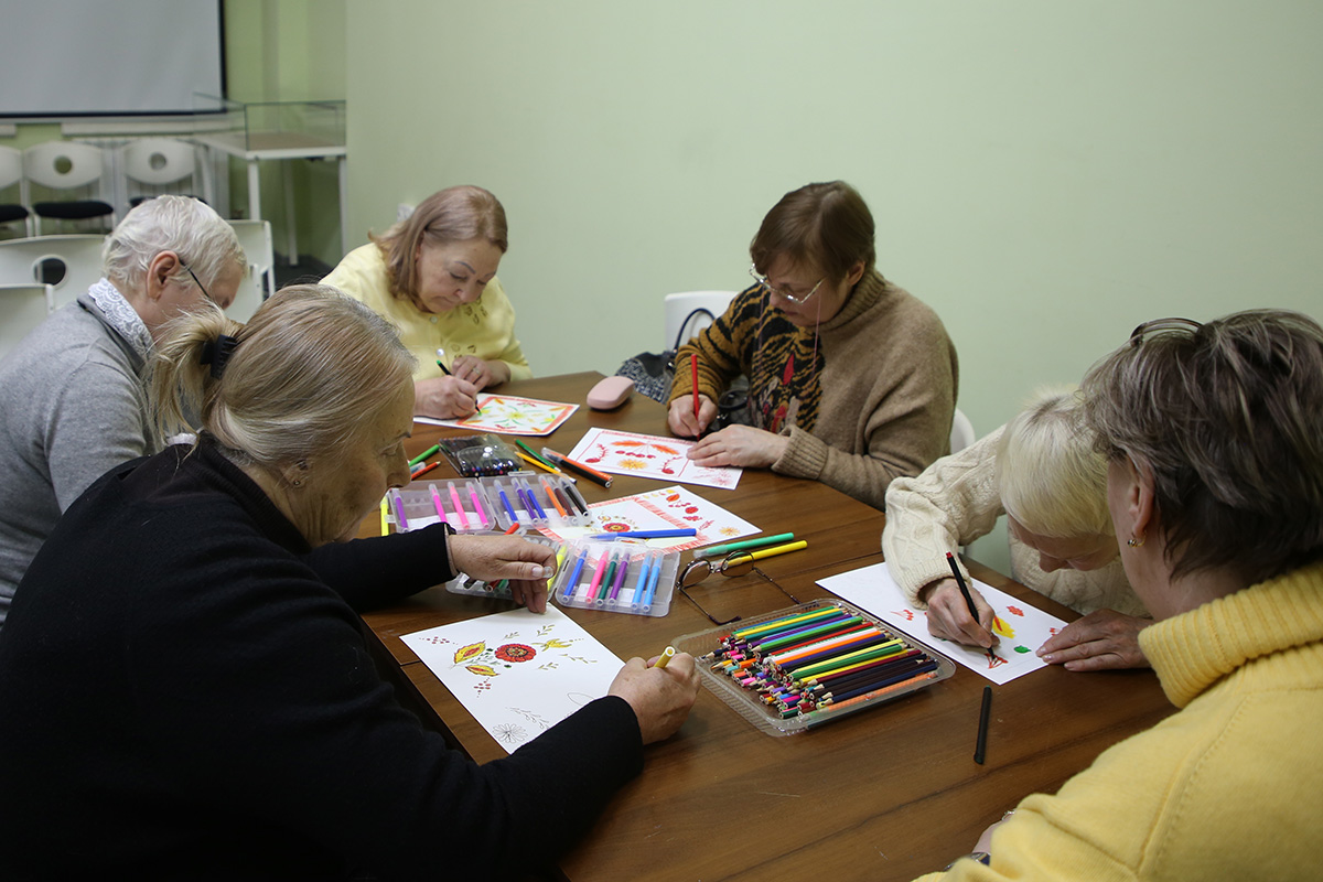 Завершил занятие мастер-класс, на котором посетители мероприятия создавали композицию по мотивам женского русского платка. После создания эскиза в карандаше оформили свои рисунки в цвете, используя различные художественные материалы.