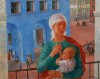 Молодая мать с ребенком на руках стоит на балконе. Ее крупно взятая на первом плане фигура выразительным силуэтом прочитывается на фоне отодвинутых в глубину эпизодов жизни города, жизни странной, почти фантастической. Представительница мира, изображенного за ее спиной, она в то же время как бы заслоняет собой младенца от грозящих извне бед. Вознесенность матери над суетой и злобой дня, монументальный масштаб ее фигуры, архаическая простота форм и локальных цветов столь явно соотносятся с образом Богородицы, что не случайно сам Петров-Водкин назвал героиню в письме к жене «Мадонной Петрограда».