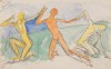 В 1908–1917 годах в графическом творчестве Петрова-Водкина преобладали этюды и эскизы, теснейшим образом связанные с картинами и монументальными росписями, созданными в это же время. Замыслы всех главных композиций (с ними он выступал на выставках Парижа, Петербурга и Москвы), составивших славу художника, сначала возникали и находили свое решение в многочисленных листах. «Берег» (1908), «Сон» (1910), «Греческое панно» (1910, местонахождение неизвестно), «Мальчики» («Играющие мальчики», 1911), «Купание красного коня» (1912), «Мать» (1913, ГТГ), «Девушки на Волге» (1915), «На линии огня» (1916) — эти названия встречаются в рисунках и набросках, принадлежащих многим музейным и частным собраниям. Они подтверждают, что в работе над композициями художник уходил от порой случайного реального впечатления и настойчиво добивался ощущения большой формы через пластическую ясность и отрицание мелочной бытовой дробности. Качество, которое когда-то Валентин Серов, любимый педагог Петрова-Водкина, назвал «парадностью», было очевидно присуще природе дарования художника, отвечало его миропониманию и корректировало задачи, поставленные им в искусстве. Наталья Козырева. О рисунках Петрова-Водкина // Кузьма Сергеевич Петров-Водкин. СПб. 2018. С. 19.