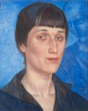Простота и благородство портрета Анны Андреевны Ахматовой сродни ее лучшим стихам. Строгий лаконичный силуэт оплечной фигуры. Матово бледное, словно источающее свет, лицо-лик, безнадежно отрешенный взгляд холодно серых глаз, горькая улыбка, чуть коснувшаяся плотно сомкнутых губ. Внешний аскетизм и предельная внутренняя собранность. За спиной поэтессы склонила в печали главу строгая дева — муза, чьему шепоту внемлют только одаренные сверхчутким слухом. Ее силуэт выступает из космической синевы фона, словно источающего свет — свет «ахматовского» серебряного месяца, ярко стывшего над Серебряным веком и теперь становящегося все холоднее и бесприютней.
