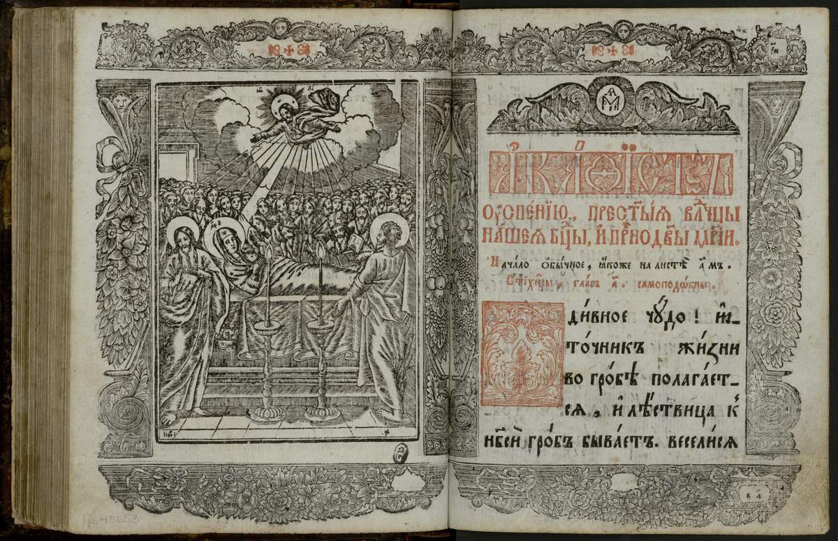 Основу изображений Успения Богоматери составляют апокрифические сказания. Это „Слово Иоанна Богослова на Успение Богородицы“ (древнейшие русские списки которого датируются XII веком) и „Слово Иоанна епископа Солунского“ (списки известны с XIV века), а также „Слова“ Андрея Критского и Германа патриарха Константинопольского, каноны на Успение Косьмы Маюмского и Иоанна Дамаскина. На основе этих сочинений было создано проложное Сказание об Успении Богоматери, которое читалось во время службы на этот великий праздник 15/28 августа и входило в состав Прологов, Синаксарей, Миней Четьих и других сборников. С середины XV века становится известен в славянском переводе приписываемый Исидору Бухиру „Акафист Успению Богородицы“, который также был включен в текст службы. Иисус Христос. СПб, 2000. С. 385.
