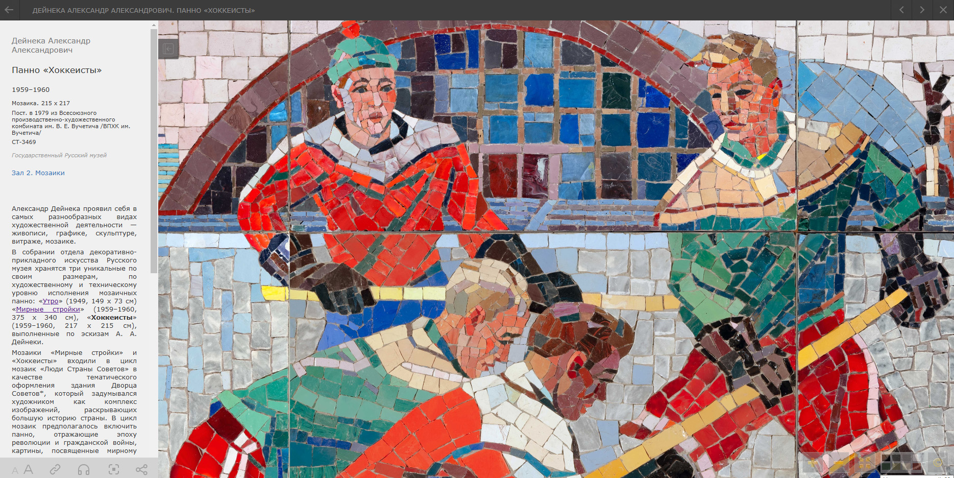 Виртуальный тур подготовлен по юбилейной выставке художника, прошедшей в залах Корпуса Бенуа с 21 февраля по 14 апреля 2025 года. Виртуальный тур позволяет увидеть около 90 произведений одного из выдающихся художников советского периода ХХ века из собрания Русского музея — живопись, графику, плакаты. В туре можно детально рассмотреть произведения, в том числе крупноформатные мозаики — «Утро», «Хоккеисты» и «Мирные стройки», узнать подробнее о творчестве художника, посмотреть серию видеоэкскурсий и послушать аудиогиды, любезно предоставленные многолетним партнером Русского музея компанией «Делия».