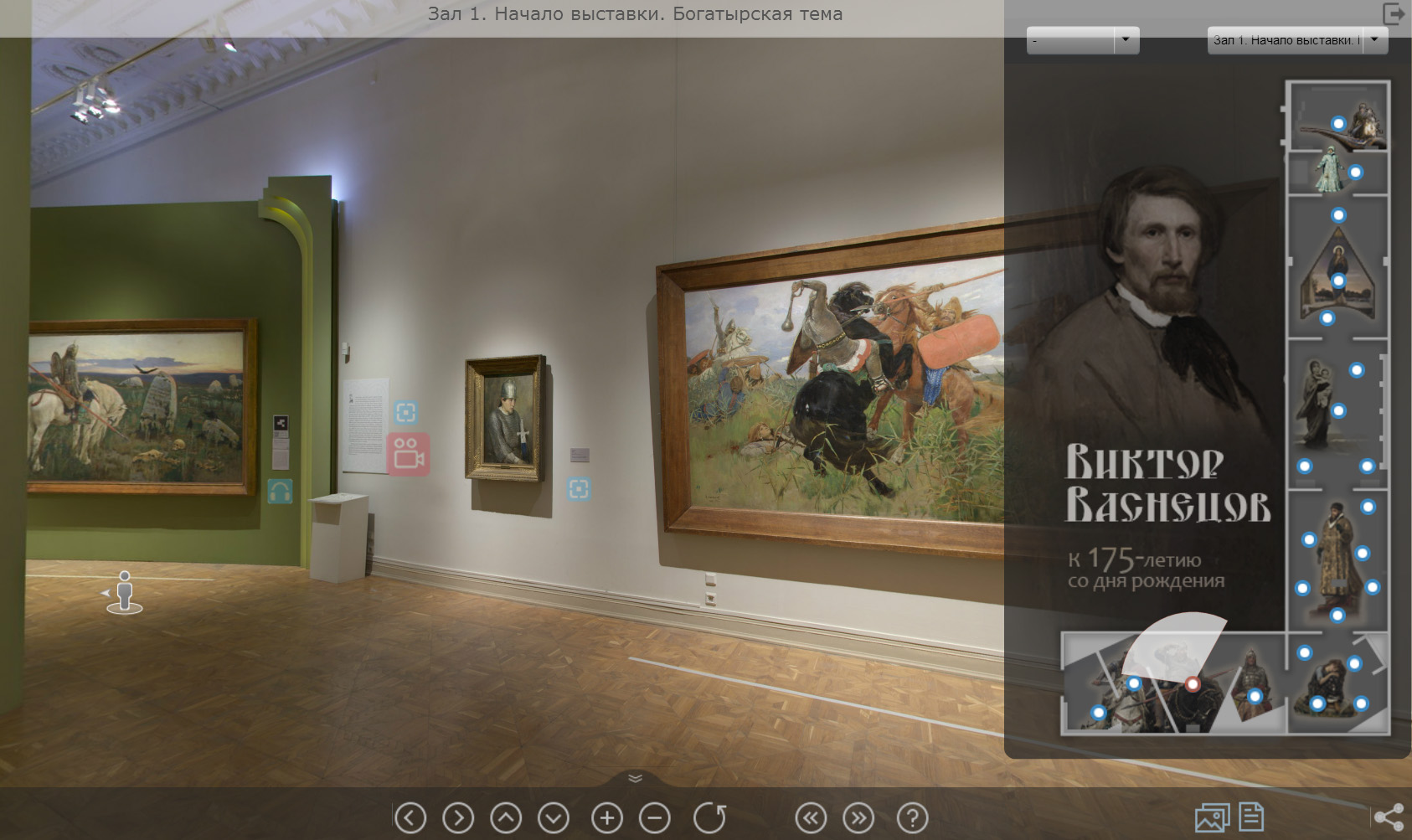 Показать полный текстВ виртуальном туре можно увидеть такие известные былинно-сказочные полотна Васнецова как «Аленушка», «Иван-Царевич на Сером Волке» (обе ГТГ), «Ковер-самолет» (Нижегородский художественный музей), «Витязь на распутье» и «Бой скифов со славянами» (обе ГРМ), одну из лучших работ цикла «Поэма семи сказок» картину «Царевна-лягушка» (Дом-музей В. М. Васнецова).