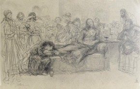 Инспектор класса Высшего художественного училища Н. А. Бруни с учениками мастерской И. Е. Репина: А. А. Мурашко и И. С. Богатыревым за самоваром